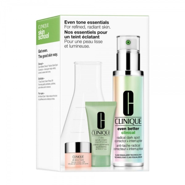 Clinique Even Tone Essentials Gift Set 50ml Even Better Clinical Radical Dark Spot Corrector + Interrupter + 30ml 7 Day Scrub Cream + 5ml All About Eyes