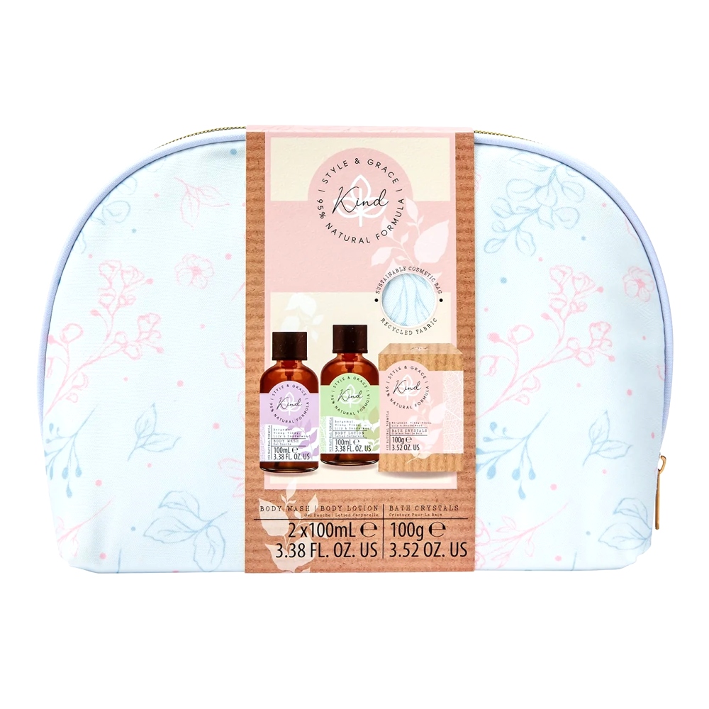 Style & Grace Kind Cosmetic Bag Gift Set 100ml Body Wash + 100ml Body Lotion + 100g Bath Salts + Cosmetic Bag